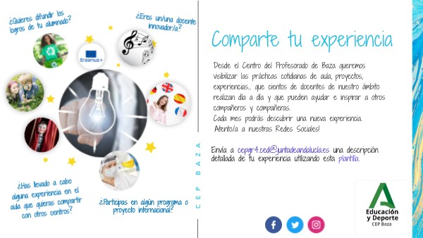 Desde el Centro del Profesorado de Baza queremos visibilizar las prácticas cotidianas de aula, proyectos, experiencias… que cientos de docentes de nuestro ámbito realizan día a día y que pueden ayudar e inspirar a otros compañeros y compañeras. Cada mes podrás descubrir una nueva experiencia. ¡Atento/a a nuestras Redes Sociales!