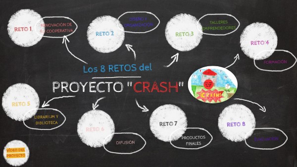 En la parte de Crea, construimos el edificio de nuestra empresa y lo dividimos en diferentes departamentos para organizarnos, estos fueron: Diseño Gráfico, Explotación Agrícola, Comunicación, Publicidad y Markenting y Asesoria. El alumnado eligió libremente colocarse en el departamento que estaba más relacionado con sus habilidades personales, favoreciendo la coeducación y la igualdad entre hombres y mujeres, pues en CRASH, tod@s son libres de moverse por los departamentos para realizar diferentes actividades. Una vez que creamos nuestro edificio formamos nuestra comunidad, con los estatutos ya realizados en la creación de nuestra empresa. Como comunidad buscamos un objetivo común a través de la generación de ideas, en formas de nubes que salen por la chimenea del edificio