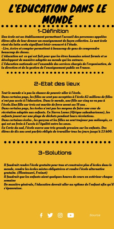Tout le monde n'a pas la chance de pouvoir aller à l'école.Dans certains pays, les filles ne sont pas acceptées à l'école.62 millions de filles n'ont pas accès à l'éducation. Dans le monde, une fille sur cinq ne va pas à l'école.Une fille sur trois est mariée de force avent ses 18 ans . Dans certains pays, les écoles n'ont pas les moyens de faire une cour de récréation adaptée aux enfants. En Sierra Leone (Afrique subsaharienne), les enfants jouent sur une plage de déchets pendant leurs récréations. Dans certaines écoles , les garçons et les filles ne sont toujousr pas mélangés, ce qui est un frein à l'accès à l'égalité entre les sexes. En Corée du sud, l'école exerce une très grande pression sur les enfants. Des élèves de dix ans sont parfois obligés de travailler tous les jours jusqu'à 23 h00.