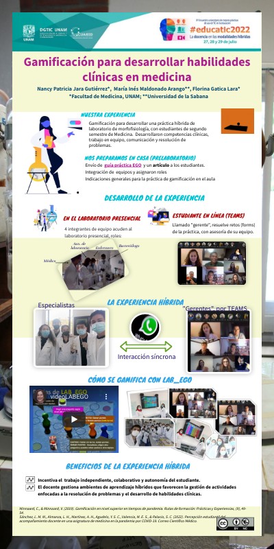 Gamificación para desarrollar una práctica híbrida de laboratorio de morfofisiología, con estudiantes de segundo semestre de Medicina. Desarrollaron competencias clínicas, trabajo en equipo, comunicación y resolución de problemas.