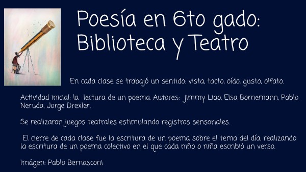 . En cada clase se trabajó un sentido: vista, tacto, oído, gusto, olfato. Actividad inicial: la lectura de un poema. Autores: jimmy Liao, Elsa Bornemann, Pablo Neruda, Jorge Drexler. Se realizaron juegos teatrales estimulando registros sensoriales. El cierre de cada clase fue la escritura de un poema sobre el tema del día, realizando la escritura de un poema colectivo en el que cada niño o niña escribió un verso. Imágen: Pablo Bernasconi