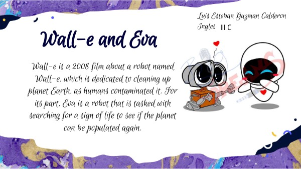 Wall-e is a 2008 film about a robot named Wall-e, which is dedicated to cleaning up planet Earth, as humans contaminated it. For its part, Eva is a robot that is tasked with searching for a sign of life to see if the planet can be populated again.