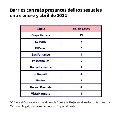 Barrios con más presuntos delitos sexuales entre enero y abril de 2022