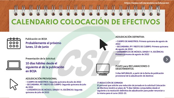 (*) REDUCCIÓN DE JORNADA El personal que solicite una reducción de jornada en la solicitud Colocación de Efectivos tendrá un plazo de *5 días hábiles computables desde el siguiente a la resolución definitiva de adjudicación para poder renunciar a la misma para el curso 2022-23.