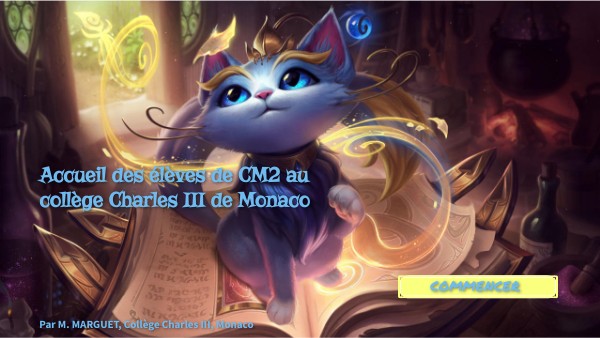 Bienvenue au Collège Charles III de Monaco. Ici, on apprend plein de choses, notamment des Mathématiques. Yuumi, le petit chat savant va essayer de voir si tu peux entrer au collège l'an prochain ! Mais pour pouvoir t'accueillir comme il se doit, tu vas devoir l'aider avant tout. Yuumi a perdu ses manuels d'apprentissage. Elle a besoin de ton aide ! Tu vas devoir résoudre quelques exercices pour les retrouver !