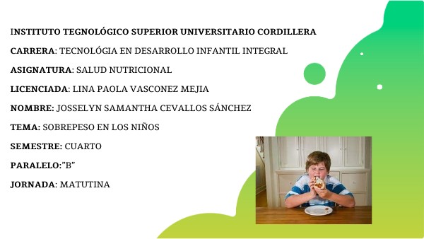 INSTITUTO TEGNOLÓGICO SUPERIOR UNIVERSITARIO CORDILLERA CARRERA: TECNOLÓGIA EN DESARROLLO INFANTIL INTEGRAL ASIGNATURA: SALUD NUTRICIONAL LICENCIADA: LINA PAOLA VASCONEZ MEJIA NOMBRE: JOSSELYN SAMANTHA CEVALLOS SÁNCHEZ TEMA: SOBREPESO EN LOS NIÑOS SEMESTRE: CUARTO PARALELO:”B” JORNADA: MATUTINA