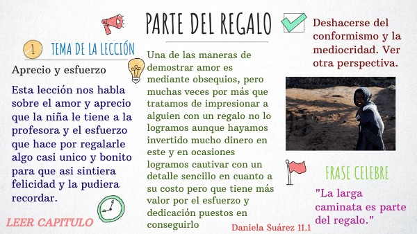 Esta lección nos habla sobre el amor y aprecio que la niña le tiene a la profesora y el esfuerzo que hace por regalarle algo casi unico y bonito para que asi sintiera felicidad y la pudiera recordar.