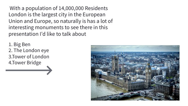 With a population of 14,000,000 Residents London is the largest city in the European Union and Europe, so naturally is has a lot of interesting monuments to see there in this presentation I'd like to talk about