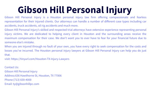 Gibson Hill Personal Injury is a Houston personal injury law firm offering compassionate and fearless representation for their injured clients. Our attorneys can handle a number of different case types including car accidents, truck accidents, oil rig accidents and much more. Gibson Hill Personal Injury’s skilled and respected trial attorneys have extensive experience representing personal injury victims. We are dedicated to helping every client in Houston and the surrounding areas receive the maximum compensation for their case. We don’t want you to ever have to fear for your financial future due to someone else’s mistake. When you are injured through no fault of your own, you have every right to seek compensation for the costs and losses you’ve incurred. The Houston personal injury lawyers at Gibson Hill Personal Injury can help you do just that. visit: https://tinyurl.com/Houston-TX-Injury-Lawyers Contact Us: Gibson Hill Personal Injury Address:636 Hawthorne St, Houston, TX 77006 Phone:(713) 659-4000 Email: ty@gibsonhillpc.com