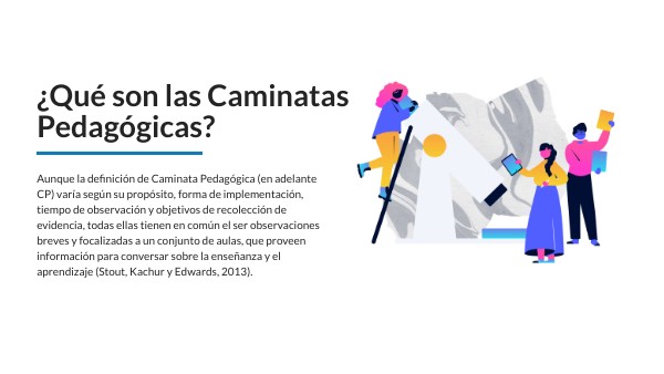 Aunque la definición de Caminata Pedagógica (en adelante CP) varía según su propósito, forma de implementación, tiempo de observación y objetivos de recolección de evidencia, todas ellas tienen en común el ser observaciones breves y focalizadas a un conjunto de aulas, que proveen información para conversar sobre la enseñanza y el aprendizaje (Stout, Kachur y Edwards, 2013).