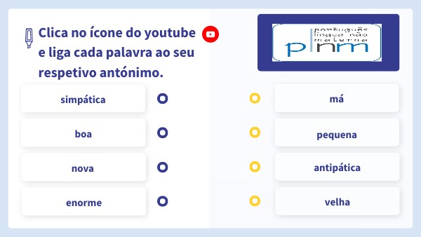Clica no ícone do youtube e liga cada palavra ao seu respetivo antónimo.