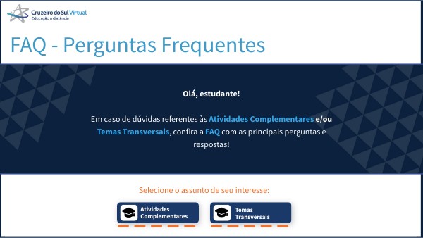 Olá, estudante! Em caso de dúvidas referentes às Atividades Complementares e/ou Temas Transversais, confira a FAQ com as principais perguntas e respostas!