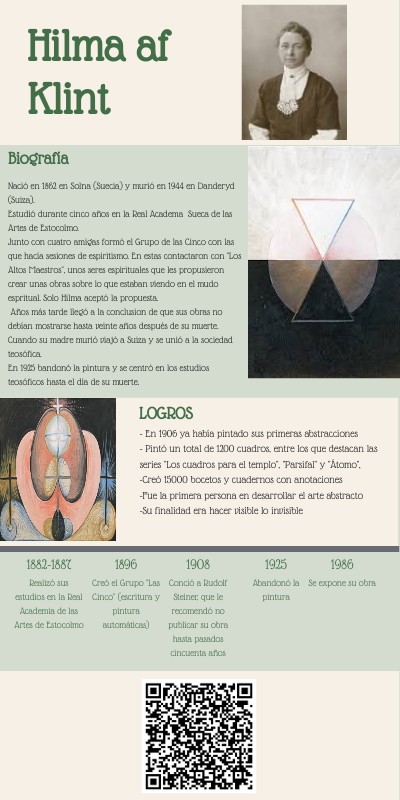 Nació en 1862 en Solna (Suecia) y murió en 1944 en Danderyd (Suiza). Estudió durante cinco años en la Real Academa Sueca de las Artes de Estocolmo. Junto con cuatro amigas formó el Grupo de las Cinco con las que hacía sesiones de espiritismo. En estas contactaron con "Los Altos Maestros", unos seres espirituales que les propusieron crear unas obras sobre lo que estaban viendo en el mudo espritual. Solo Hilma aceptó la propuesta. Años más tarde llegó a la conclusion de que sus obras no debían mostrarse hasta veinte años después de su muerte. Cuando su madre murió viajó a Suiza y se unió a la sociedad teosófica. En 1925 bandonó la pintura y se centró en los estudios teosóficos hasta el día de su muerte.