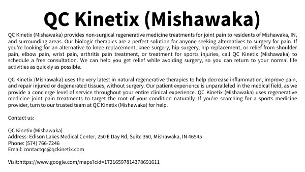 QC Kinetix (Mishawaka) provides non-surgical regenerative medicine treatments for joint pain to residents of Mishawaka, IN, and surrounding areas. Our biologic therapies are a perfect solution for anyone seeking alternatives to surgery for pain. If you're looking for an alternative to knee replacement, knee surgery, hip surgery, hip replacement, or relief from shoulder pain, elbow pain, wrist pain, arthritis pain treatment, or treatment for sports injuries, call QC Kinetix (Mishawaka) to schedule a free consultation. We can help you get relief while avoiding surgery, so you can return to your normal life activities as quickly as possible. QC Kinetix (Mishawaka) uses the very latest in natural regenerative therapies to help decrease inflammation, improve pain, and repair injured or degenerated tissues, without surgery. Our patient experience is unparalleled in the medical field, as we provide a concierge level of service throughout your entire clinical experience. QC Kinetix (Mishawaka) uses regenerative medicine joint pain treatments to target the root of your condition naturally. If you're searching for a sports medicine provider, turn to our trusted team at QC Kinetix (Mishawaka) for help. Contact us: QC Kinetix (Mishawaka) Address: Edison Lakes Medical Center, 250 E Day Rd, Suite 360, Mishawaka, IN 46545 Phone: (574) 766-7246 Email: contactqc@qckinetix.com Visit:https://www.google.com/maps?cid=17216597814378691611