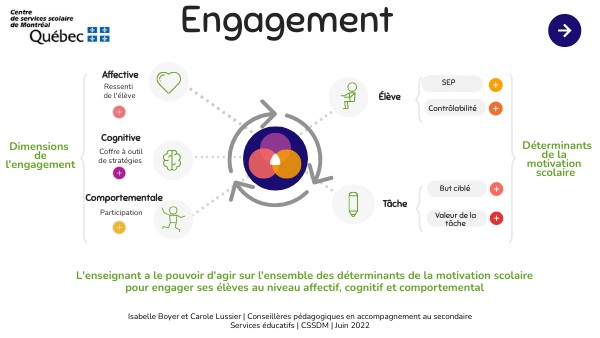 Séverine Parent, Favoriser la motivation et l'engagment des étudiants, https://mobile.eduq.info/xmlui/bitstream/handle/11515/37793/parent-31-4_0-2018.pdf Réseau réussite Montréal, Motivation et engagement, https://www.reseaureussitemontreal.ca/dossiers-thematiques/motivation-engagement/ Dusseault, Martin; Pandémie: 10 pistes d'action pour raviver la motivation des adolescents, https://centdegres.ca/ressources/pandemie-10-pistes-d-action-pour-raviver-la-motivation-des-adolescents