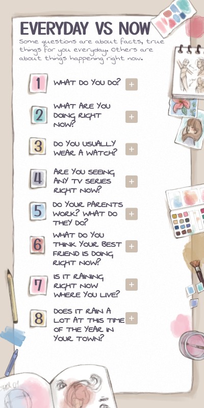 Some questions are about facts, true things for you everyday. Others are about things happening right now.