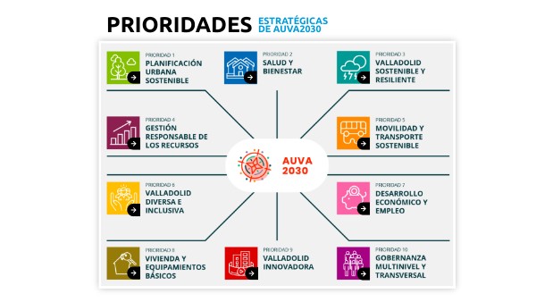 INSTRUMENTOS DE IMPLEMENTACIÓN: Plan General de Ordenación Urbana, PGOU, Plan Estratégico de Turismo, Estrategias y programas de empleo, Plan Integral de apoyo al comercio de proximidad, Centro de apoyo a emprendedores, Iniciativa Valladolid Próxima y Plan Territorial de Protección Civil del municipio de Valladolid. ODS RELACIONADOS: 1, 2, 5, 8, 9 y 12.