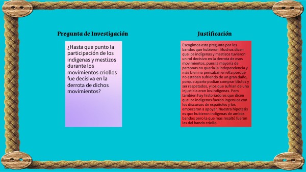 Escogimos esta pregunta por los bandos que hubieron. Muchos dicen que los indígenas y mestizos no tuvieron un rol decisivo en la derrota de esos movimientos, pues mas bien fueron una ayuda, porque la mayoría de personas no quería la independencia y no pensaban en ella porque no estaban sufriendo de un gran daño, aparte podían comprar títulos y ser respetados, y los que sufrian de una injusticia eran los indigenas. Pero tambien hay historiadores que dicen que los indigenas fueron ingenuos con los discursos de españoles y los empezaron a apoyar. Nuestra hipotesis es que hubieron indigenas de ambos bandos pero la que mas resaltó fueron las del bando criollo.