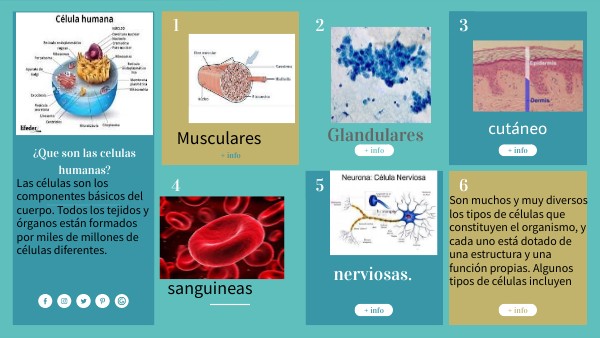Son muchos y muy diversos los tipos de células que constituyen el organismo, y cada uno está dotado de una estructura y una función propias. Algunos tipos de células incluyen