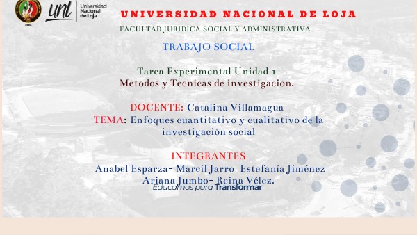 TRABAJO SOCIALTarea Experimental Unidad 1 Metodos y Tecnicas de investigacion. DOCENTE: Catalina Villamagua TEMA: Enfoques cuantitativo y cualitativo de la investigación social INTEGRANTES Anabel Esparza- Marcil Jarro Estefanía Jiménez Ariana Jumbo- Reina Vélez.