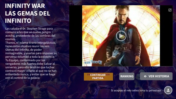 Les saluda el Dr. Stephen Strage para comunicarles que un nuevo peligro acecha, procedente de las sombras del cosmos. Thanos, el infame tirano intergaláctico, tiene como objetivo reunir las seis Gemas del Infinito, de poder inimaginable, y usarlas para imponer su perversa voluntad a toda la existencia. Tu Equipo, conformado por los vengadores más fuertes debe Salvar al universo, para ello tendrán que luchar contra el mayor villano al que no se han enfrentado nunca, y evitar que se haga con el control de la galaxia