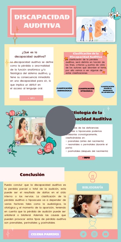 Puedo concluir que la discapacidad auditiva es la perdida parcial o total de la audición, esta puede ser el resultado de daños en el oído interno o los nervios. La clasificación de la pérdida auditiva o hipoacusia va a depender de varios factores tales como la audiológica, la otológica y el momento de la aparición, teniendo en cuenta que la pérdida de audición puede ser unilateral o bilateral. Además las causas que pueden provocar estos tipos de pérdida auditiva son prenatales, perinatales y postnatales.