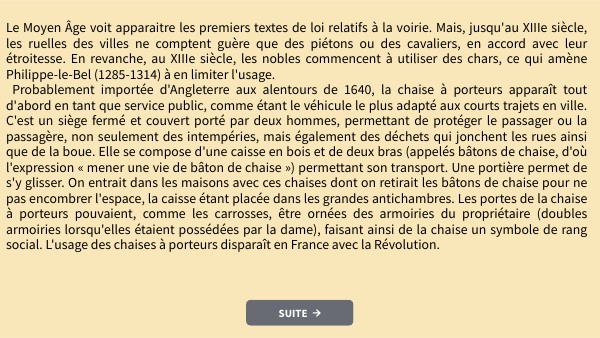 Le Moyen Âge voit apparaitre les premiers textes de loi relatifs à la voirie. Mais, jusqu'au XIIIe siècle, les ruelles des villes ne comptent guère que des piétons ou des cavaliers, en accord avec leur étroitesse. En revanche, au XIIIe siècle, les nobles commencent à utiliser des chars, ce qui amène Philippe-le-Bel (1285-1314) à en limiter l'usage. Probablement importée d'Angleterre aux alentours de 1640, la chaise à porteurs apparaît tout d'abord en tant que service public, comme étant le véhicule le plus adapté aux courts trajets en ville. C'est un siège fermé et couvert porté par deux hommes, permettant de protéger le passager ou la passagère, non seulement des intempéries, mais également des déchets qui jonchent les rues ainsi que de la boue. Elle se compose d'une caisse en bois et de deux bras (appelés bâtons de chaise, d'où l'expression « mener une vie de bâton de chaise ») permettant son transport. Une portière permet de s'y glisser. On entrait dans les maisons avec ces chaises dont on retirait les bâtons de chaise pour ne pas encombrer l'espace, la caisse étant placée dans les grandes antichambres. Les portes de la chaise à porteurs pouvaient, comme les carrosses, être ornées des armoiries du propriétaire (doubles armoiries lorsqu'elles étaient possédées par la dame), faisant ainsi de la chaise un symbole de rang social. L'usage des chaises à porteurs disparaît en France avec la Révolution.
