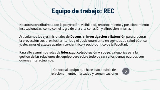 Nosotros contribuimos con la proyección, visibilidad, reconocimiento y posicionamiento institucional así como con el logro de una alta cohesión y alineación interna. Articulamos los ejes misionales de Docencia, Investigación y Extensión para procurar la proyección social en los territorios y el posicionamiento en agendas de salud pública y, elevamos el estatus académico-científico y socio-político de la Facultad. Para ello asumimos roles de liderazgo, colaboración y apoyo, categorías para la gestión de las relaciones del equipo pero sobre todo de cara a los demás equipos con quienes interactuamos.