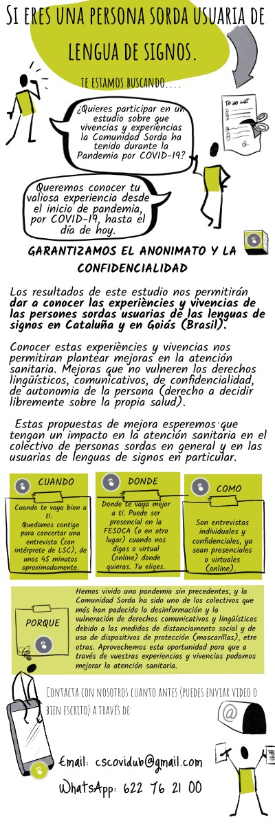 Hemos vivido una pandemia sin precedentes, y la Comunidad Sorda ha sido uno de los colectivos que más han padecido la desinformación y la vulneración de derechos comunicativos y lingüísticos debido a las medidas de distanciamento social y de uso de dispositivos de protección (mascarillas), etre otras. Aprovechemos esta oportunidad para que a través de vuestras experiencias y vivencias podamos mejorar la atención sanitaria.