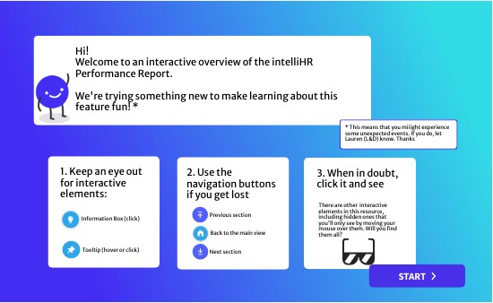 Hi! Welcome to an interactive overview of the intelliHR Performance Report. We're trying something new to make learning about this feature fun! *