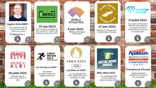 Derrière chaque carte se cache des informations sur l'événement survenu à cette période. Le lieu de la compétition, la distance et discipline concernée et le temps accompli avec au final un titre ou un record établi.