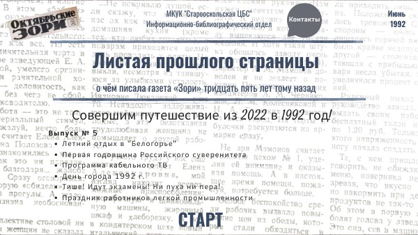 МКУК «Старооскольская ЦБС» Центральная библиотека имени А. С. Пушкина Информационно-библиографический отдел г. Старый Оскол, мкр. Жукова, 30 «в» Телефон: 46-02-60 График работы: Пн-чт: с 10.00 до 21.00, Сб, вс: с 10.00 до 20.00 Выходной: пятница Последний день месяца – санитарный Архив газеты "Зори" для вас листала Анастасия Золотарева