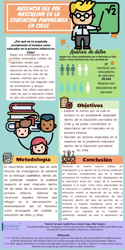 Bibliografía:A. C. V (2014, 10 diciembre). ¿Por qué no hay docentes varones en las aulas de educación infantil? elconfidencial.com. E. (2019). Deconstruir roles desde la niñez: los hombres protagonistas de la educación parvularia. Educrea. S. P, 2020. Apenas 49 hombres en el paÃs son educadores de parvulos: U. de Chile y colectivo “Cotonas Verdes, buscan eliminar estereotipo de que solo las mujeres cuidan.”LaTercera.