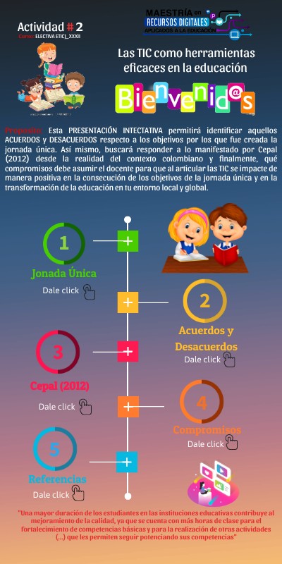 Proposito: Esta PRESENTACIÓN INTECTATIVA permitirá identificar aquellos ACUERDOS y DESACUERDOS respecto a los objetivos por los que fue creada la jornada única. Así mismo, buscará responder a lo manifestado por Cepal (2012) desde la realidad del contexto colombiano y finalmente, qué compromisos debe asumir el docente para que al articular las TIC se impacte de manera positiva en la consecución de los objetivos de la jornada única y en la transformación de la educación en tu entorno local y global.