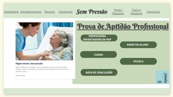 Muitas destas feridas podem ser evitadas e foi a partir dai que surgiu a ideia de criar o site " Sem Pressão- Úlceras de pressão”. O principal objetivo deste projeto é fornecer informação relevante e ajudar os cuidadores informais de como podem prevenir as UPP nos seus familiares dependentes do leito. A realização deste projeto foi um grande desafio para mim pois obrigou-me a sair da minha zona de conforto. Só foi possivel desenvolve-lo com a colaboração das professoras, colegas e dos meus familiares. No meu ponto de vista, um ponto negativo na realização deste projeto foi a
