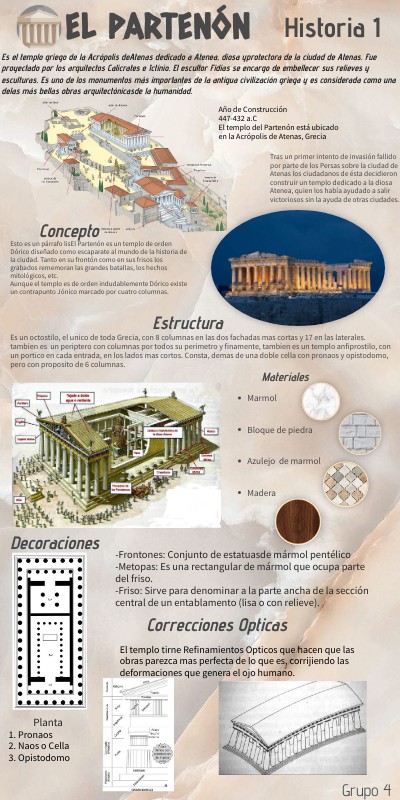 Esto es un párrafo lisEl Partenón es un templo de orden Dórico diseñado como escaparate al mundo de la historia de la ciudad. Tanto en su frontón como en sus frisos los grabados rememoran las grandes batallas, los hechos mitológicos, etc. Aunque el templo es de orden indudablemente Dórico existe un contrapunto Jónico marcado por cuatro columnas.