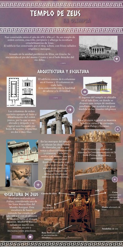 Escultura realizada por Fidias, considerada una de las Siete Maravillas del Mundo Antiguo. Esta escultura de busto redondo fue creada en el año 430 a.C con el objetivo de rendirle culto al dios en cuestión. Media 12 metros, tallada en marfil con detalles en oro e incrustaciones preciosas.