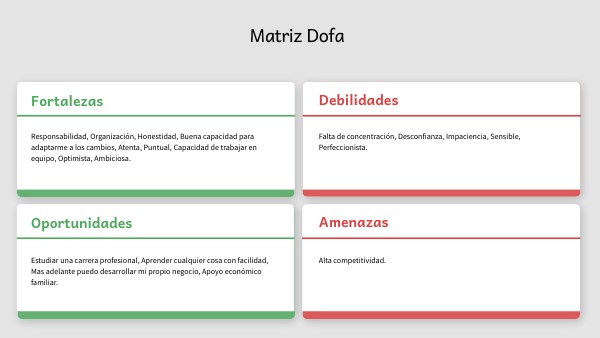 Responsabilidad, Organización, Honestidad, Buena capacidad para adaptarme a los cambios, Atenta, Puntual, Capacidad de trabajar en equipo, Optimista, Ambiciosa.