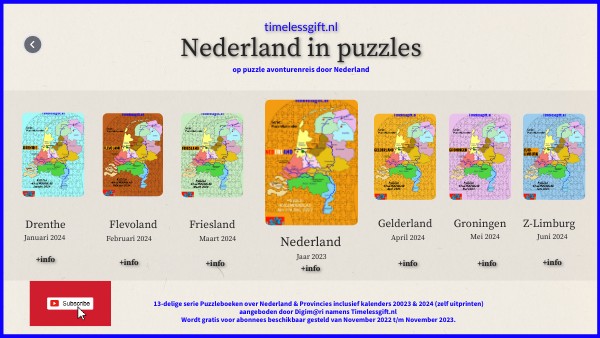 13-delige serie Puzzleboeken over Nederland & Provincies inclusief kalenders 20023 & 2024 (zelf uitprinten) aangeboden door Digim@ri namens Timelessgift.nl Wordt gratis voor abonnees beschikbaar gesteld van November 2022 t/m November 2023.