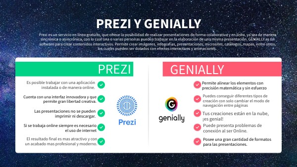 Prezi es un servicio en línea gratuito, que ofrece la posibilidad de realizar presentaciones de forma colaborativa y en línea, ya sea de manera sincrónica o asincrónica, con lo cual una o varias personas pueden trabajar en la elaboración de una misma presentación. GENIALLY es un software para crear contenidos interactivos. Permite crear imágenes, infografías, presentaciones, microsites, catálogos, mapas, entre otros, los cuales pueden ser dotados con efectos interactivos y animaciones.