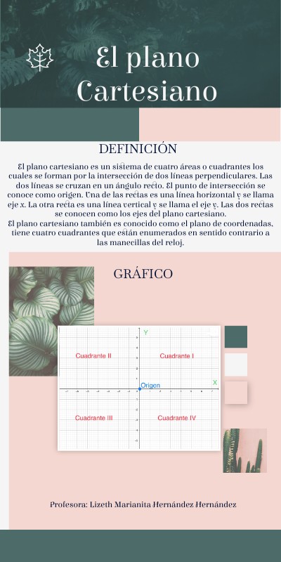 El plano cartesiano es un sistema de cuatro áreas o cuadrantes los cuales se forman por la intersección de dos líneas perpendiculares. Las dos líneas se cruzan en un ángulo recto. El punto de intersección se conoce como origen. Una de las rectas es una línea horizontal y se llama eje x. La otra recta es una línea vertical y se llama el eje y. Las dos rectas se conocen como los ejes del plano cartesiano. El plano cartesiano también es conocido como el plano de coordenadas, tiene cuatro cuadrantes que están enumerados en sentido contrario a las manecillas del reloj.