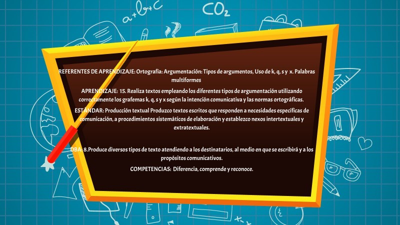 REFERENTES DE APRENDIZAJE: Ortografía: Argumentación: Tipos de argumentos, Uso de k, q, s y x. Palabras multiformes APRENDIZAJE: 15. Realiza textos empleando los diferentes tipos de argumentación utilizando correctamente los grafemas k, q, s y x según la intención comunicativa y las normas ortográficas. ESTÁNDAR: Producción textual Produzco textos escritos que responden a necesidades específicas de comunicación, a procedimientos sistemáticos de elaboración y establezco nexos intertextuales y extratextuales. DBA: 8.Produce diversos tipos de texto atendiendo a los destinatarios, al medio en que se escribirá y a los propósitos comunicativos. COMPETENCIAS: Diferencia, comprende y reconoce.