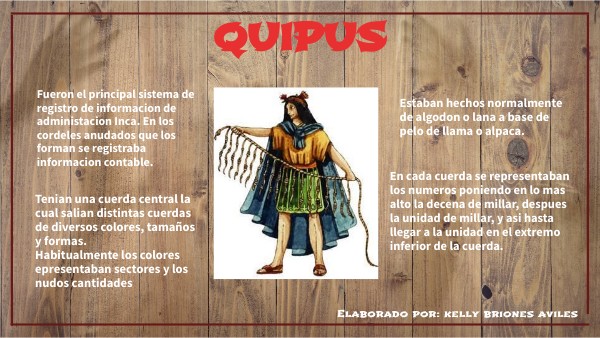Fueron el principal sistema de registro de informacion de administacion Inca. En los cordeles anudados que los forman se registraba informacion contable.