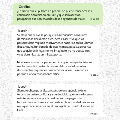 Siempre obtengo la visa a través de una agencia o de un tercero en quien confío. Y ya he decidido que no me interesa más tener esta visa por la cual tienes que pagar una fortuna. La visa dominicana cuesta en la actualidad tres veces más que hacer una cita en el Embajada de Estados Unidos en Haití.