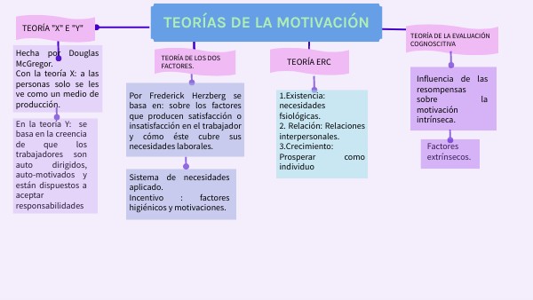 A. (2015, 26 junio). TEORIA DE EVALUACION COGNITIVA. Ensayos y Trabajos - andrey793. Recuperado 10 de julio de 2022, de https://www.clubensayos.com/Negocios/TEORIA-DE-EVALUACION-COGNITIVA/2611793.html#:%7E:text=La%20Teor%C3%ADa%20de%20la%20Evaluaci%C3%B3n%20Cognitiva%20busca%20determinar,provoca%20una%20disminuci%C3%B3n%20de%20la%20motivaci%C3%B3n%20intr%C3%ADnseca%20inicial.J. (2021, 13 diciembre). Teoría X e Y de Douglas McGregor. Economía desde Casa. Recuperado 10 de julio de 2022, de https://economiadesdecasa.com/teoria-x-e-y-de-douglas-mcgregor/#:%7E:text=La%20teor%C3%ADa%20X%20y%20la%20teor%C3%ADa%20Y%20son,los%20empleados%20y%2C%20en%20%C3%BAltima%20instancia%2C%20termina%20cumpliendoseLopez, M. (2015, 31 agosto). TEORÃA DEL FLUJO Y LA MOTIVACIÃN INTRINSECA. Prezi.Com. Recuperado 10 de julio de 2022, de https://prezi.com/0bva5g2yqfdg/teoria-del-flujo-y-la-motivacion-intrinseca/Mitjana, L. R., & Mitjana, L. R. (2019, 14 marzo). La teoría de fijación de metas de Edwin Locke. Psicología y Mente. Recuperado 10 de julio de 2022, de https://psicologiaymente.com/psicologia/teoria-fijacion-metas-lockeOlivo, B. A. (s. f.). LA TEORÍA DE LA EQUIDAD DE JOHN STACY ADAMS (1). Scribd. Recuperado 10 de julio de 2022, de https://es.scribd.com/document/481126588/LA-TEORIA-DE-LA-EQUIDAD-DE-JOHN-STACY-ADAMS-1#:%7E:text=La%20Teor%C3%ADa%20de%20la%20equidad%20laboral%20es%20una,la%20motivaci%C3%B3n%20de%20un%20empleado%20depende%20del%20equilibrioPuerta, A. R. (2020, 7 septiembre). Teoría del reforzamiento de Skinner: bases y ejemplos. Lifeder. Recuperado 10 de julio de 2022, de https://www.lifeder.com/teoria-reforzamiento-skinner/#:%7E:text=La%20teor%C3%ADa%20del%20reforzamiento%20de%20Skinner%20es%20una,en%20funci%C3%B3n%20de%20premios%20%28llamados%20refuerzos%29%20o%20castigos.Salvador, I. R., & Salvador, I. R. (2017, 19 octubre). La Teoría del Factor Dual de Frederick Herzberg. Psicología y Mente. Recuperado 10 de julio de 2022, de https://psicologiaymente.com/organizaciones/teoria-factor-dual-frederick-herzberg