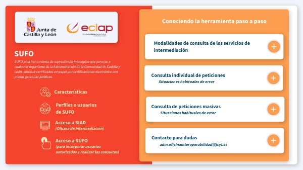 SUFO es la herramienta de supresión de fotocopias que permite a cualquier organismo de la Administración de la Comunidad de Castilla y León, sustituir certificados en papel por certificaciones electrónico con plenas garantías jurídicas.