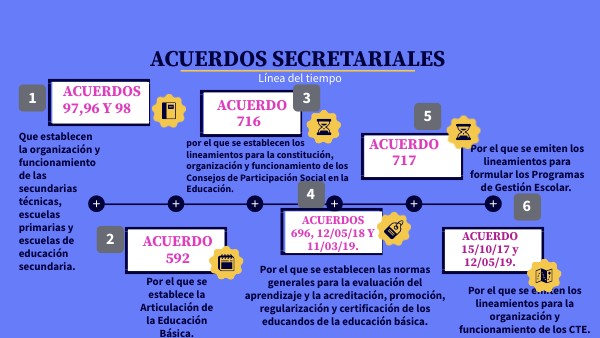 Estos acuerdos rigen la organización y funcionamiento de las escuelas secundarias técnicas (acuerdo 97 publicado el 03/12/1982 ), escuelas primarias (96) y escuelas de educación secudaria (98 ) ambos publicados el 07/12/1982. estípulan qué le corresponde a cada una como por ejemplo: propiciar que se cumplan los objetivos de la educación, promover el desarrollo integral del educando, aplicar y desarrollar los planes, programas de estudio y contenidos (de modo que los conocimientos, las habilidades, los hábitos y las aptitudes que se adquieran, sean aplicables en la vida ulterior del educando) aprobados por la Secretaría de Educación Pública. Los libros de texto gratuitos son de uso obligatorio, clasifican a las escuelas, se establecen las funciones del director y enmarcan de manera general las normas jurídicas y pedagógicas a las que deberán ajustarse las escuelas que se rigen con dichos acuerdos.