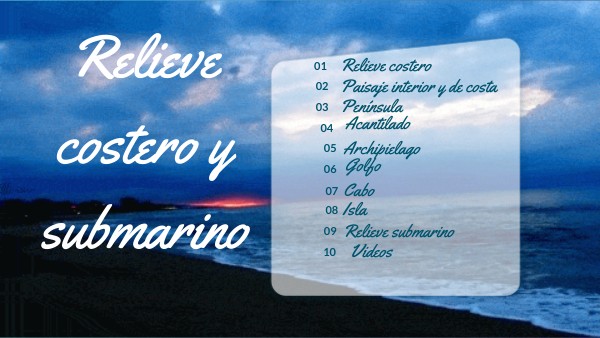 Relieve costero:Conjunto de accidentes geográficos que encontramos en las zonas costeras de los continentes y de las islas.