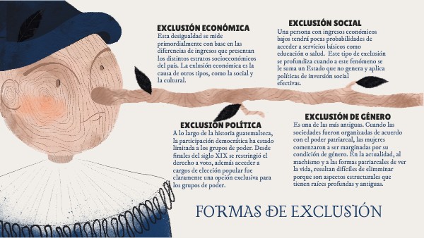 Está unido a la exclusión cultural y étnica. El establecimiento legal del monolingüísmo, a favor de quienes hablan castellano, y el hecho de ver los idiomas indígenas simplemente como parte del patrimonio cultural de la nación son muestras de la exclusión lingüística que ha prevalecido en Guatemala.