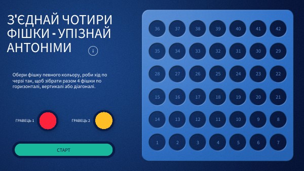 Обери фішку певного кольору, роби хід по черзі так, щоб зібрати разом 4 фішки по горизонталі, вертикалі або діагоналі.